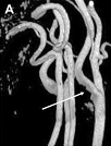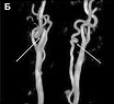 (Магнитно-резонансная ангиография артерий). Белыми стрелками показаны: сужение (стеноз) правой внутренней сонной артерии (А); стеноз левой сонной артерии и закупорка (окклюзия) правой (В); окклюзия левой внутренней сонной артерии (В); стеноз правой позвоночной артерии (Г); извитость правой и левой сонных артерий (Д)).
