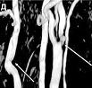 Рис. 3. МРТ-реконструкция брахиоцефальных артерий.(Магнитно-резонансная ангиография артерий). Белыми стрелками показаны: сужение (стеноз) правой внутренней сонной артерии (А); стеноз левой сонной артерии и закупорка (окклюзия) правой (В); окклюзия левой внутренней сонной артерии (В); стеноз правой позвоночной артерии (Г); извитость правой и левой сонных артерий (Д)).